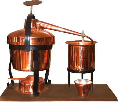 - un récipient en cuivre avec serpentin de condensation équipé d’une entrée et d’une sortie d’eau