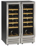 DUO: Armoire à vin deux compartiments séparés: 1 pour les blancs (5° à 12°C) et 1 pour les rouges (12° à 18°C). Capacité: 155 bouteilles (type 75cl) 14 clayettes coulissantes en bois massif - Système d'hygrométrie - Encastrable. Element de chauffage si utilisation en pièce non chauffée. Dimensions: 180 h x 59,50 l x 68,50 p